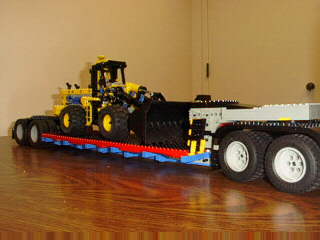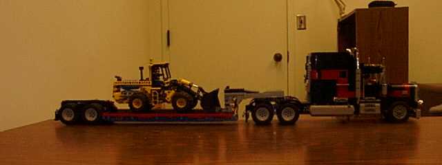 This "huge" truck is a further modification to the "big" truck. For this model my friend and I increased the sleeping compartment to include a sink/toilet/shower. Also a double drop deck gooseneck trailer was constructed and the Technic Front End Loader added.