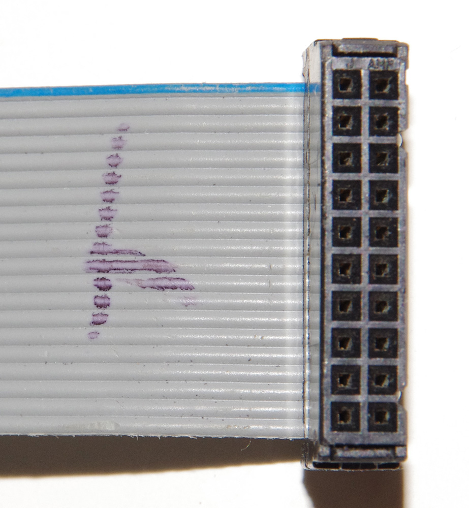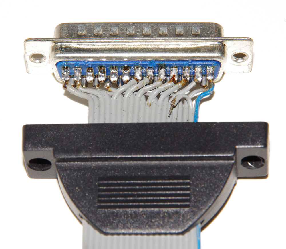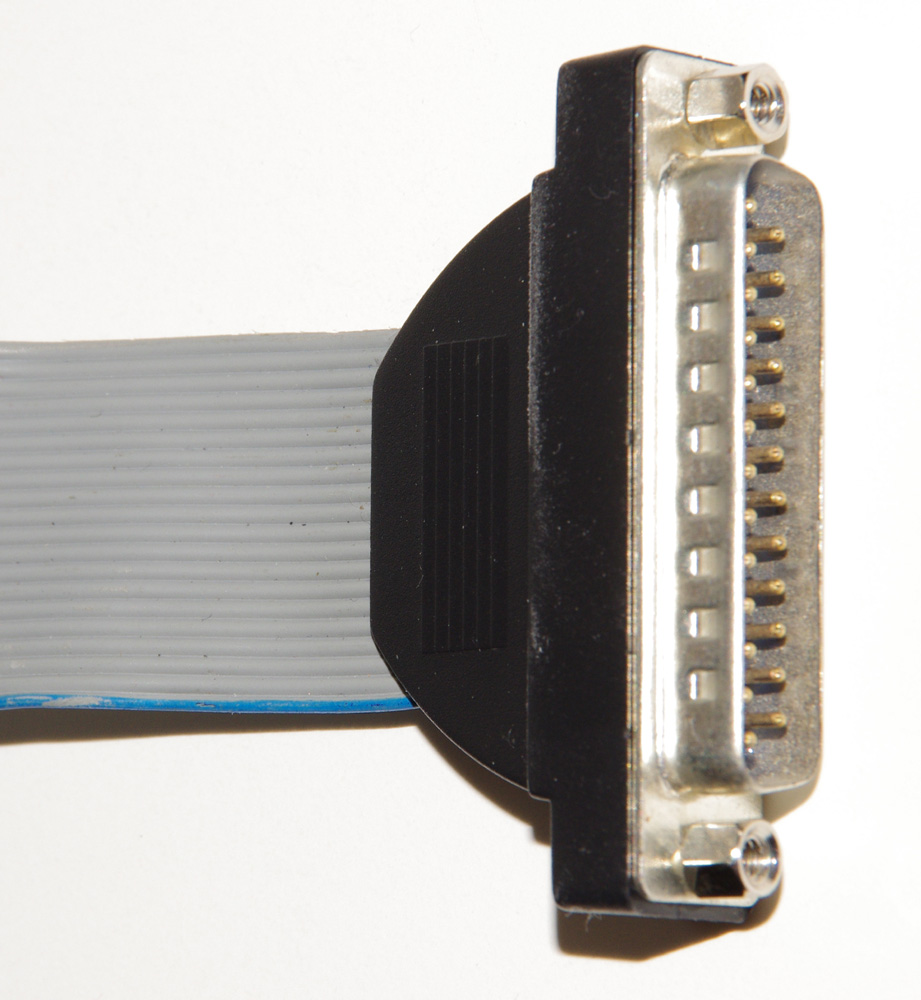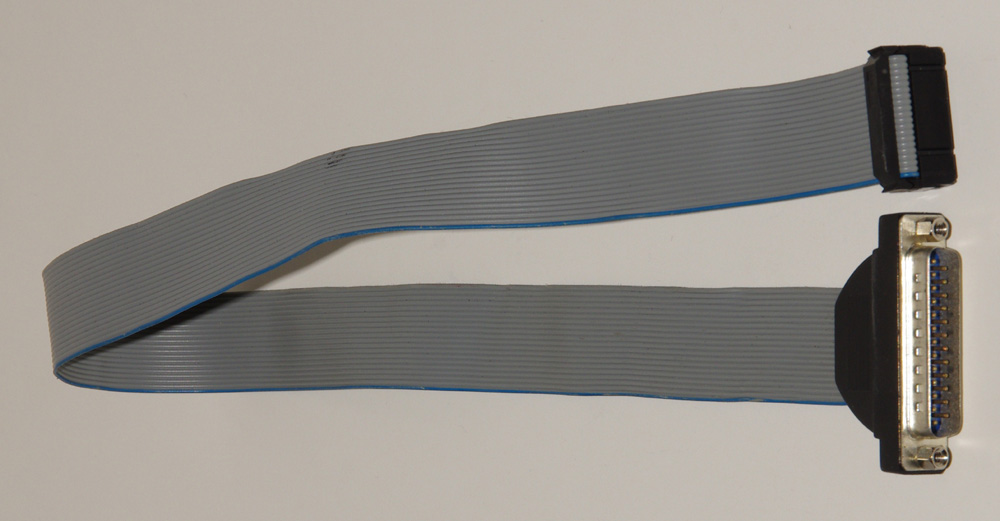 To build the custom cable I used a standard 20 conductor ribbon cable with a 20-pin IDC connector on one end. The other end will need to be cut, stripped, and soldered to a male DB25 connector. I found a ribbon cable in my junk box. You can purchase one or you could use the LEGO cable by cutting off one of the connectors. For the DB25 connector, I used an old 25-pin serial PC back plane.